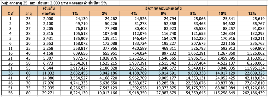 หวังว่าทุกคนจะลองเอาไปทำตามกันนะครับ ผมมีรูปตารางของผลลัพธ์การออมเงิน โดยสมมุติตัวละครเป็นหนุ่มสาวที่เพิ่งเข้าสู่วัยทำงาน ตารางที่ 1 เริ่มออมที่ 2,000 บาท/เดือน และออมเพิ่มในอัตรา 5% ต่อปี และตารางที่ 2 เริ่มออมที่ 3,000 บาท/เดือน และออมเพิ่มในอัตรา 5% ต่อปี เช่นเดียวกัน พบว่า