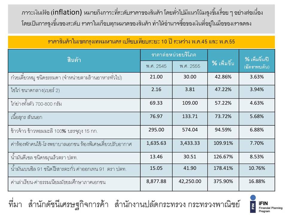 - ข้อมูลเงินเฟ้อของปี 2555 เมื่อเทียบกับค่าใช้จ่ายปีฐาน ปี 2545 (10ปี ย้อนหลัง)