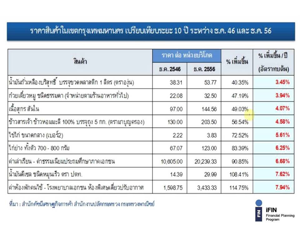 - ข้อมูลเงินเฟ้อของปี 2556 เมื่อเทียบกับค่าใช้จ่ายปีฐาน ปี 2546 (10ปี ย้อนหลัง เช่นกัน)